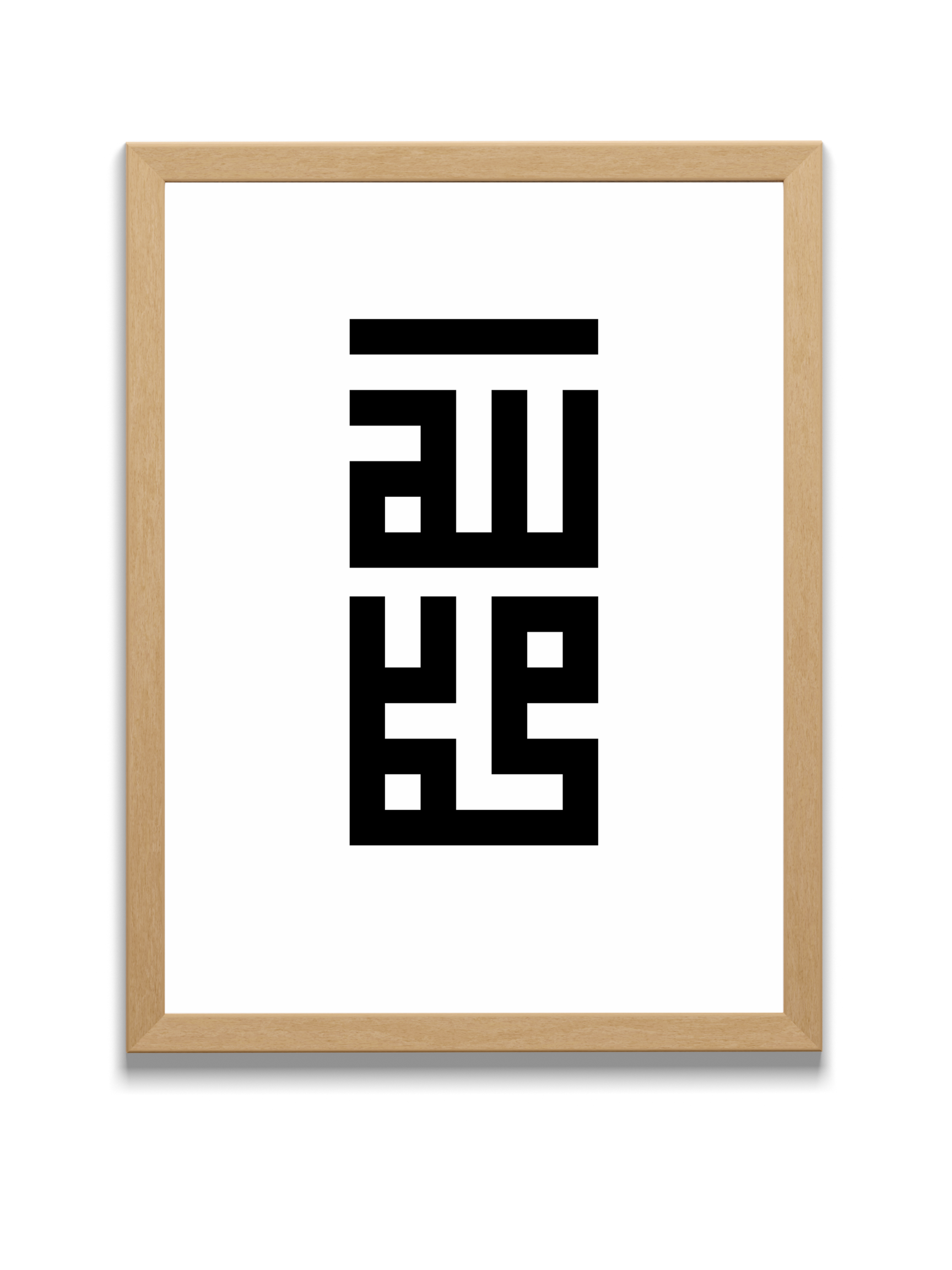 DESIGN: Simplicity and clarity. Featuring strong, bold lines that make it legible even from a distance, like towering snow capped mountains stabilizing the earth, this square kufic calligraphic design shows God, Allah, and his messenger, Muhammad (pbuh) in arabic. There is an absolute evenness of full and empty spaces signifying balance and control.