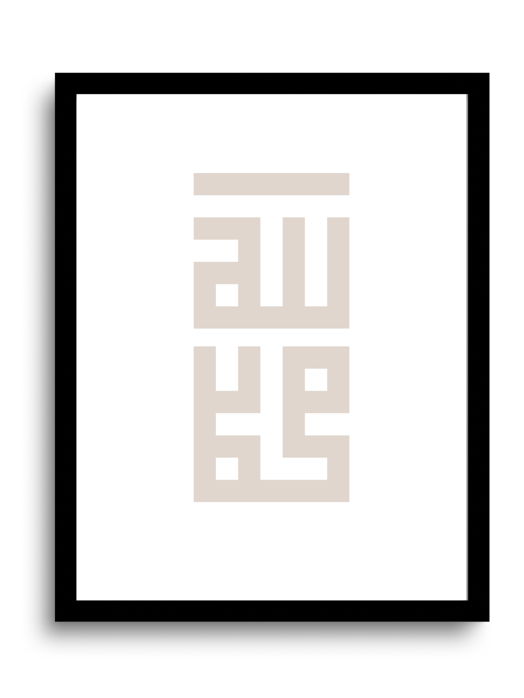 DESIGN: Simplicity and clarity. Featuring strong, bold lines that make it legible even from a distance, like towering snow capped mountains stabilizing the earth, this square kufic calligraphic design shows God, Allah, and his messenger, Muhammad (pbuh) in arabic. There is an absolute evenness of full and empty spaces signifying balance and control.